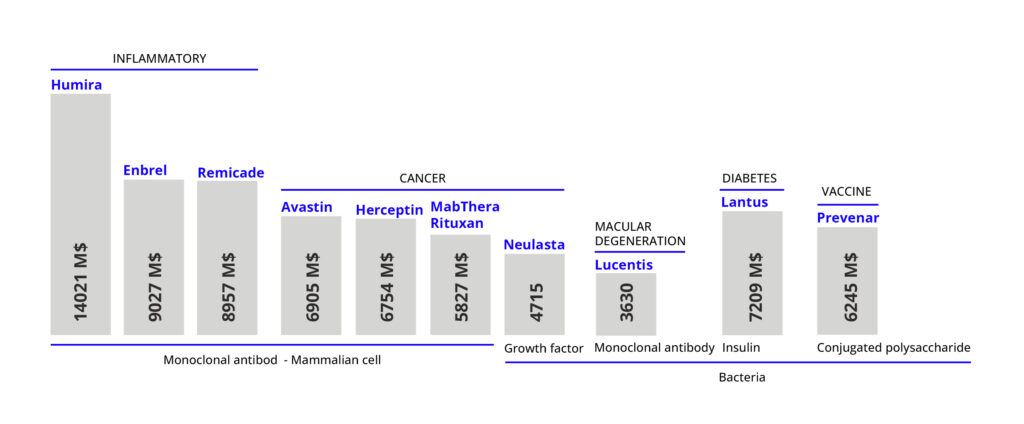 El uso de estos biofármacos se ha generalizado, llegando a un valor de mercado estimado en 617 billones americanos de dólares en 2024, lo cual representa ya una parte importante de los 1747 billones americanos de dólares de valor de mercado total de fármacos en 2024, y con una perspectiva de que su mercado se doble en 2032 [1,2].